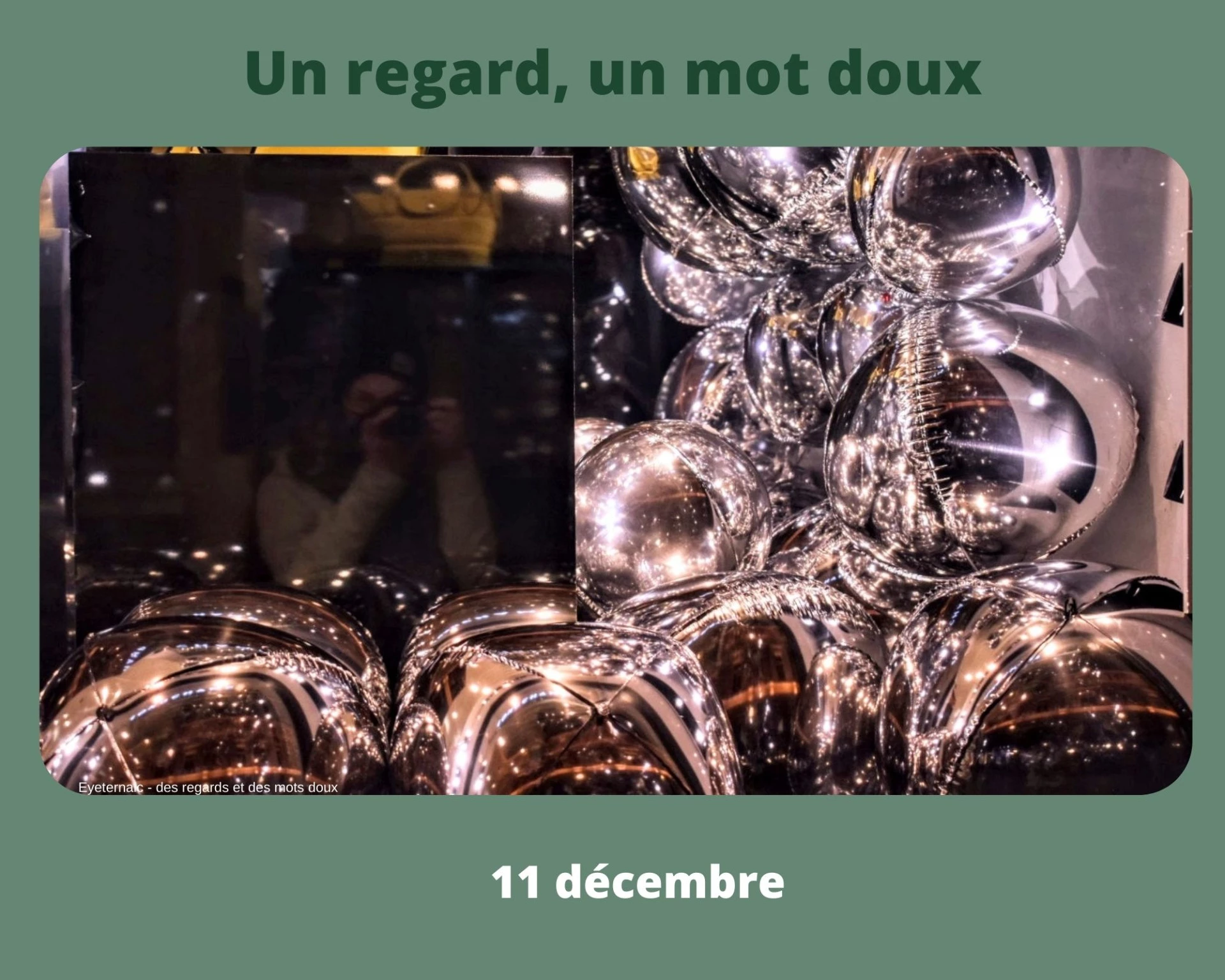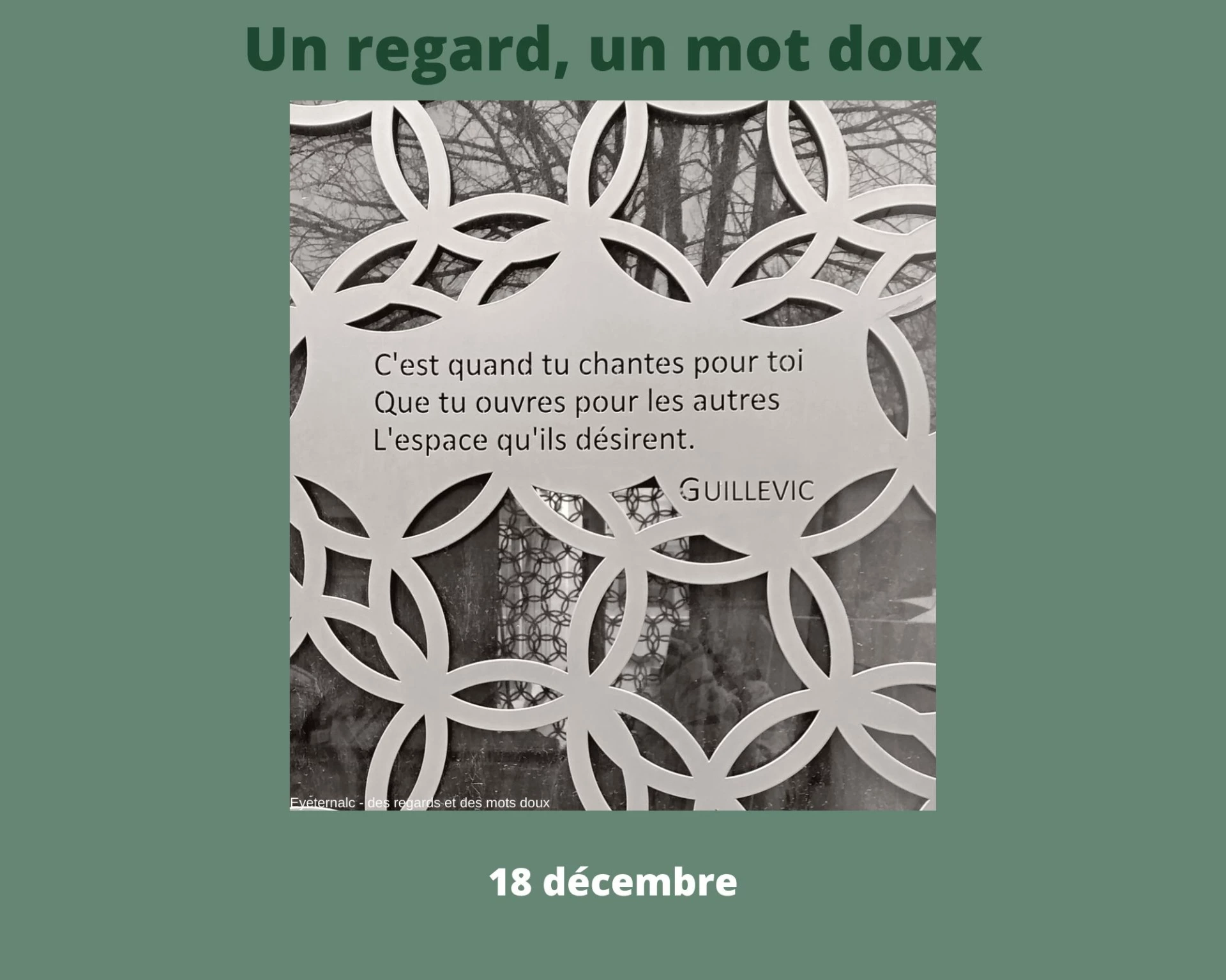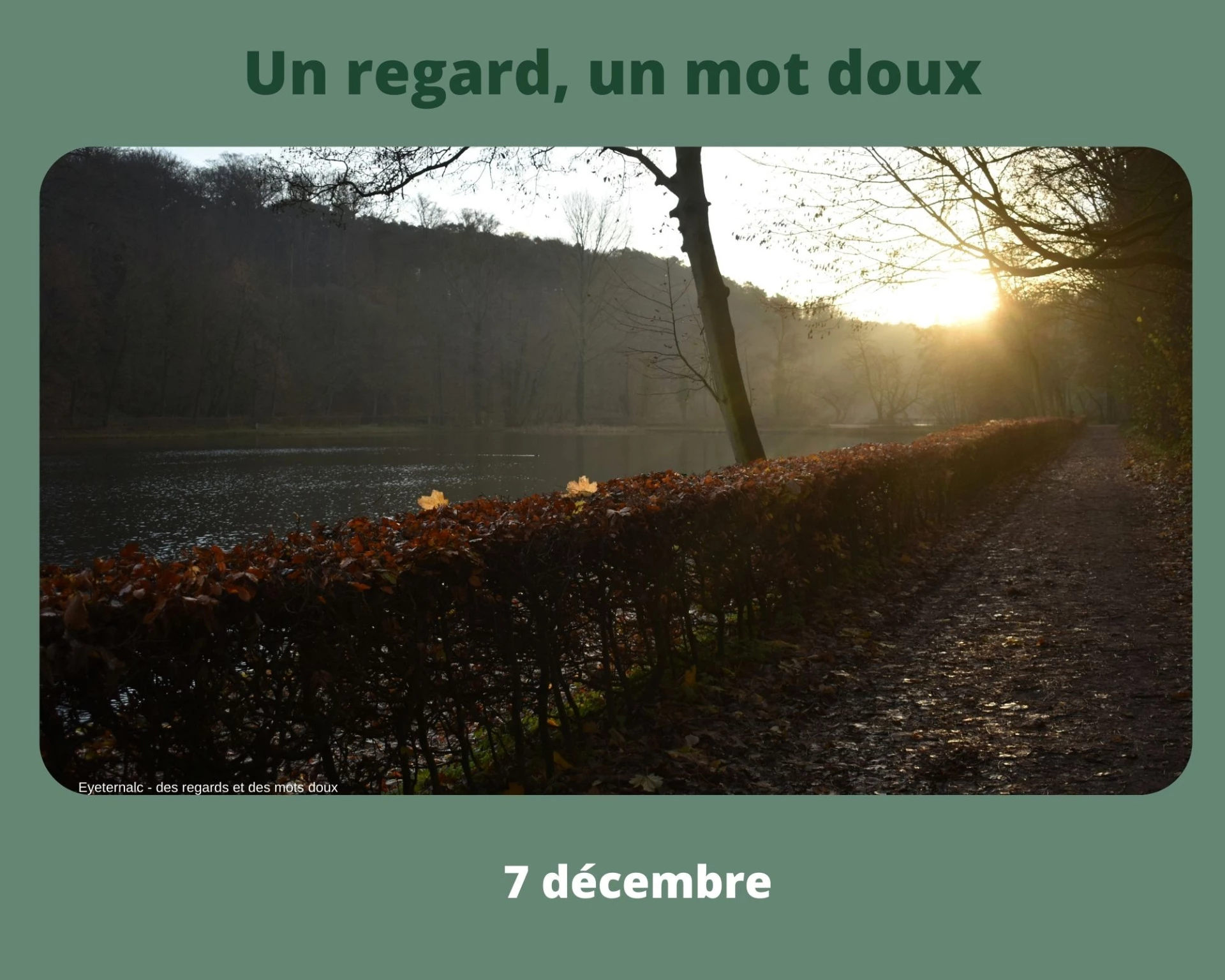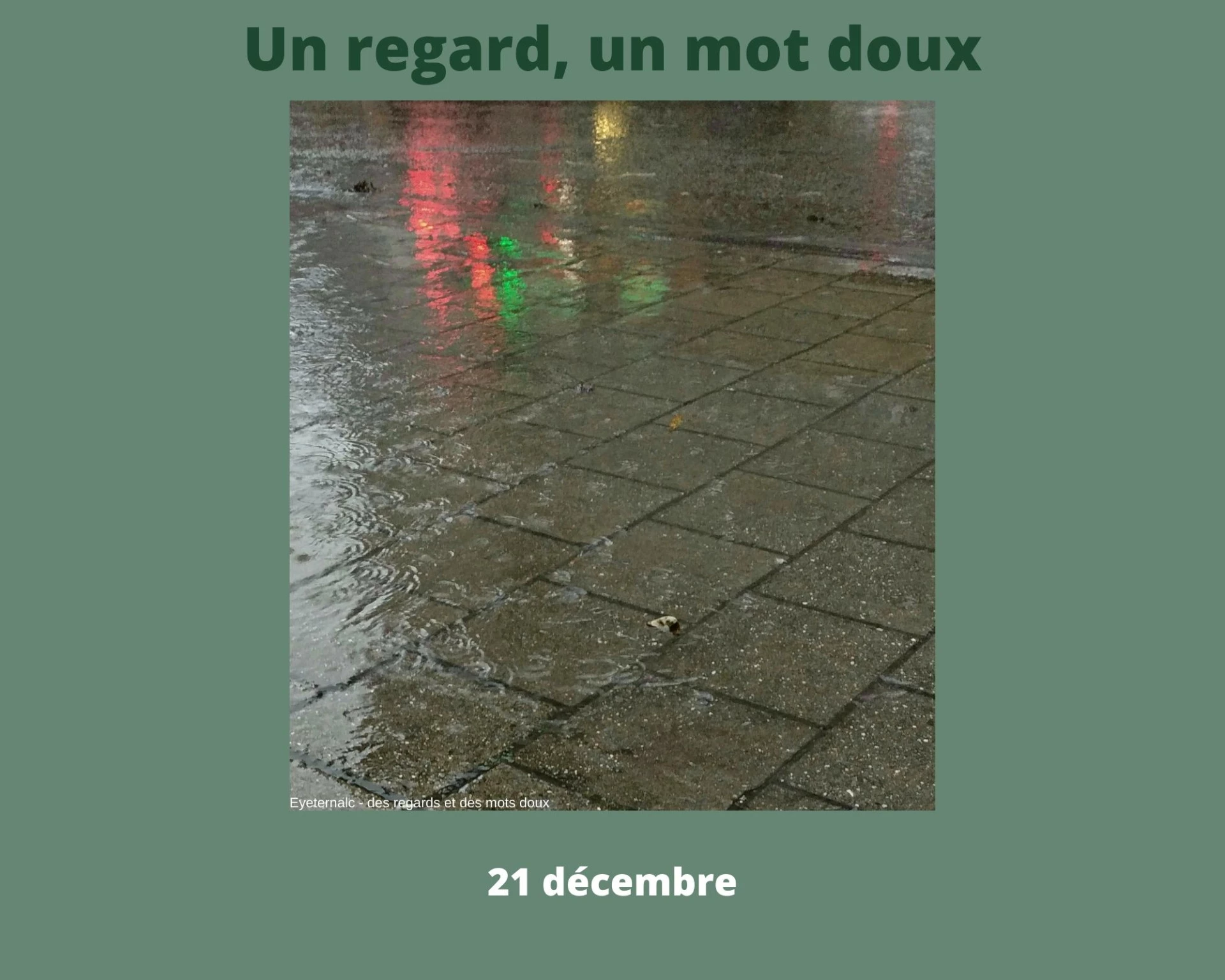 Un regard par jour jusqu’au 25 décembre,Un regard pour contempler en silence,Un regard sur le quotidien,Un regard pour savourer ce qui est, ni plus, ni moins,Un regard sur un instant, un moment de la journée.Un regard sur ce qui est beau, interpellant.