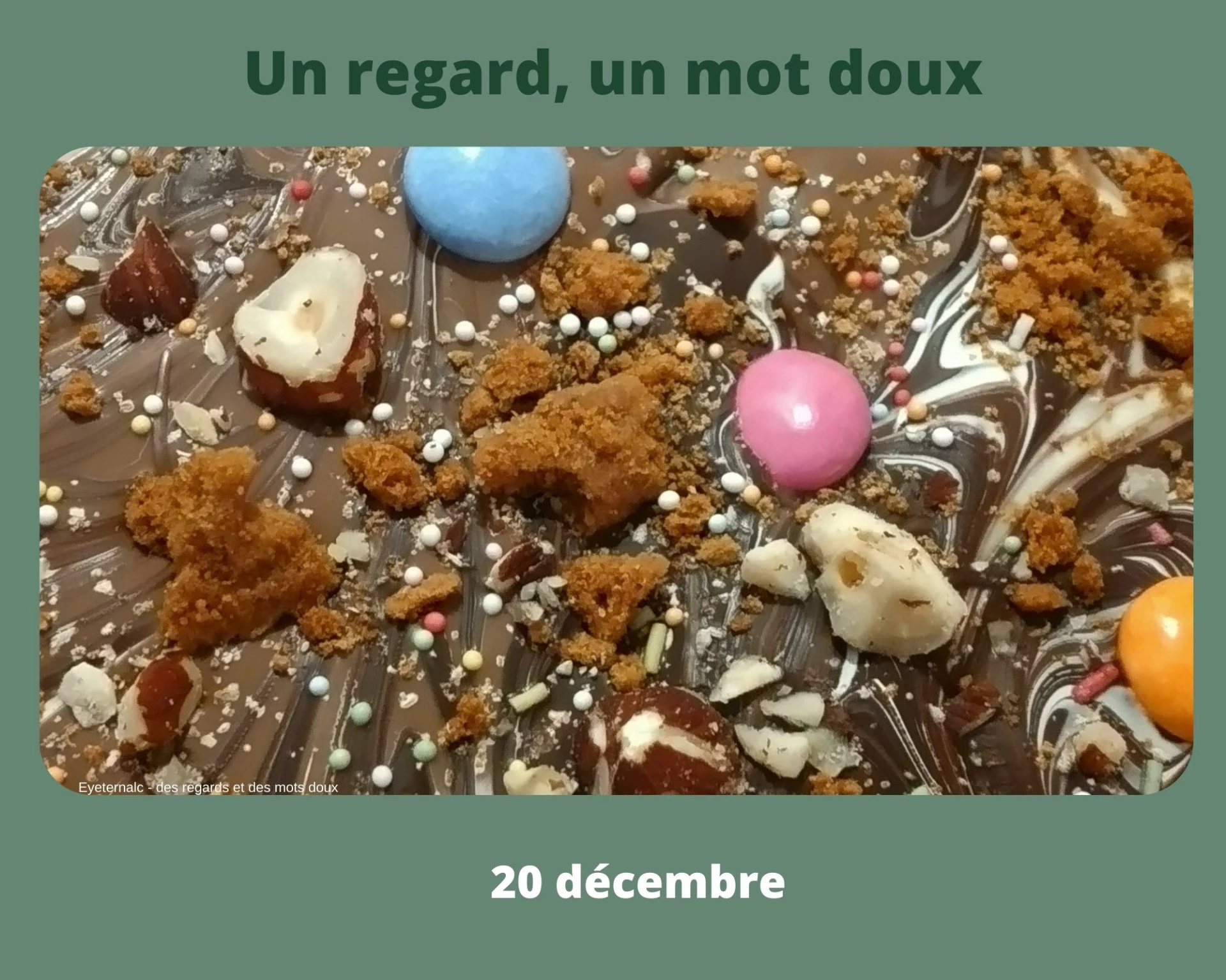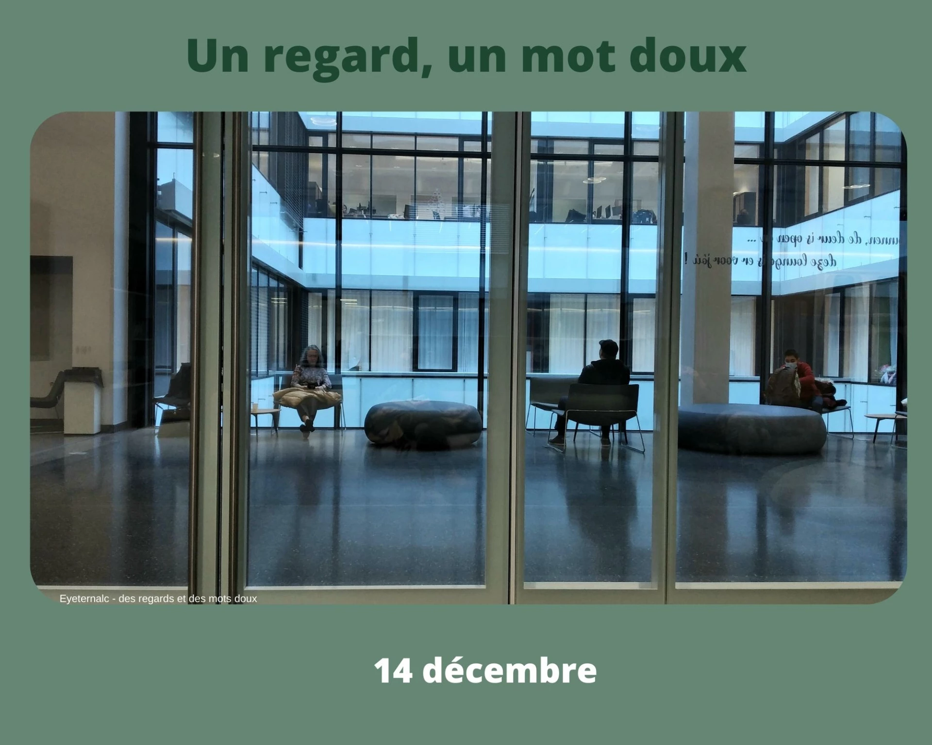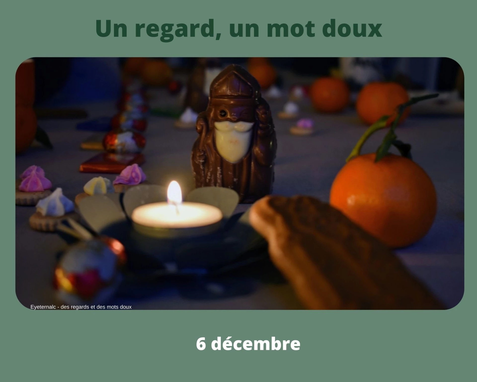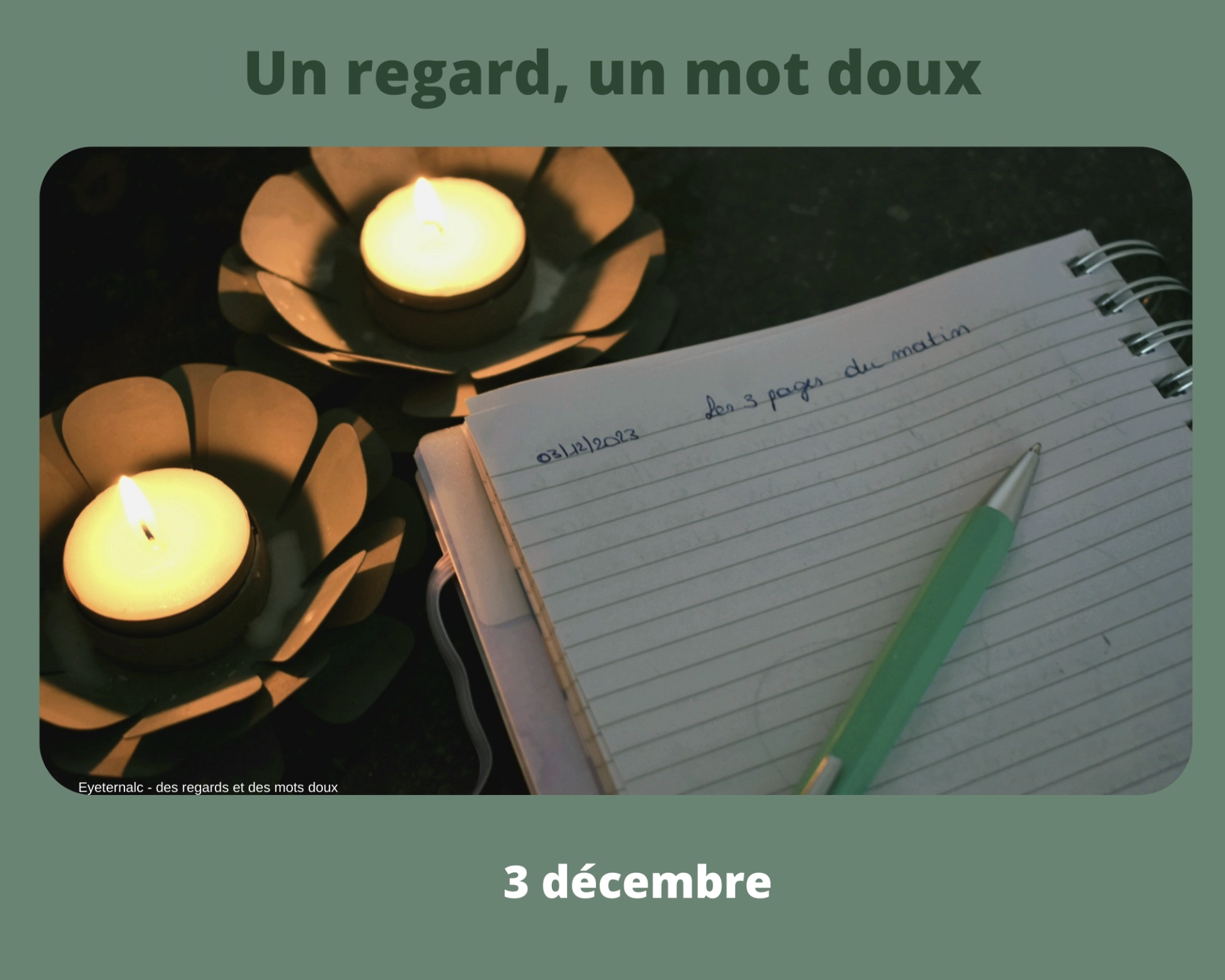 Un regard par jour jusqu’au 25 décembre,Un regard pour contempler en silence,Un regard sur le quotidien,Un regard pour savourer ce qui est, ni plus, ni moins,Un regard sur un instant, un moment de la journée.Un regard sur ce qui est beau, interpellant.